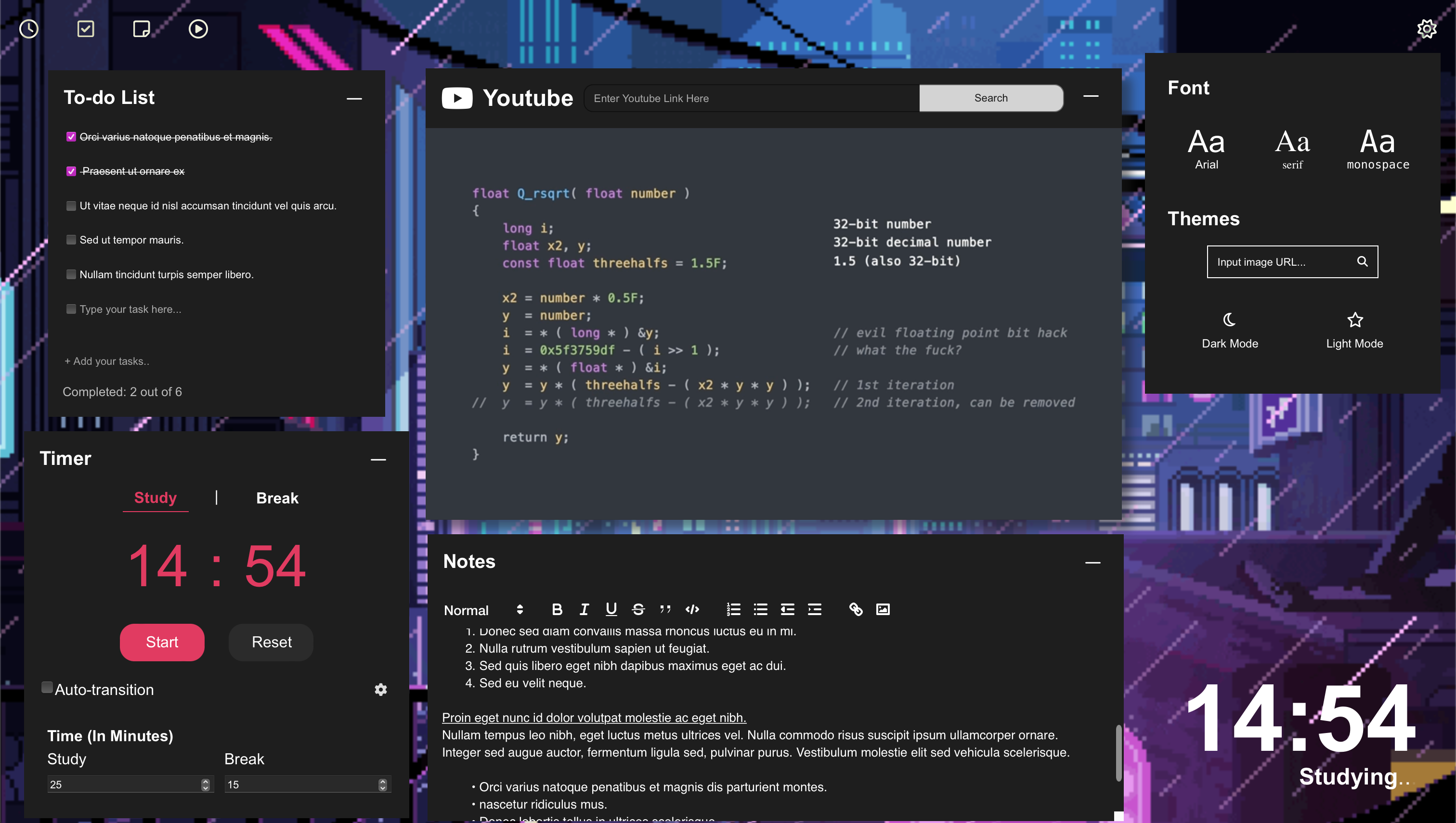 A customisable productivity app with multiple widgets such as a pomodoro timer, YouTube player and notepad.